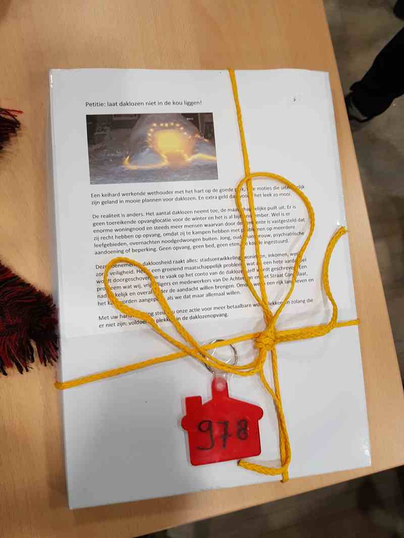 Op 28 november jl. bood het Straat Consulaat samen met haar achterban de petitie “laat daklozen niet in de kou liggen” aan, aan raadsleden en wethouder Bert van Alphen. De petitie waarin gevraagd wordt om voldoende en fatsoenlijke nachtopvang voor de daklozen onze stad haalde bijna duizend handtekeningen op en honderden persoonlijke reacties.
