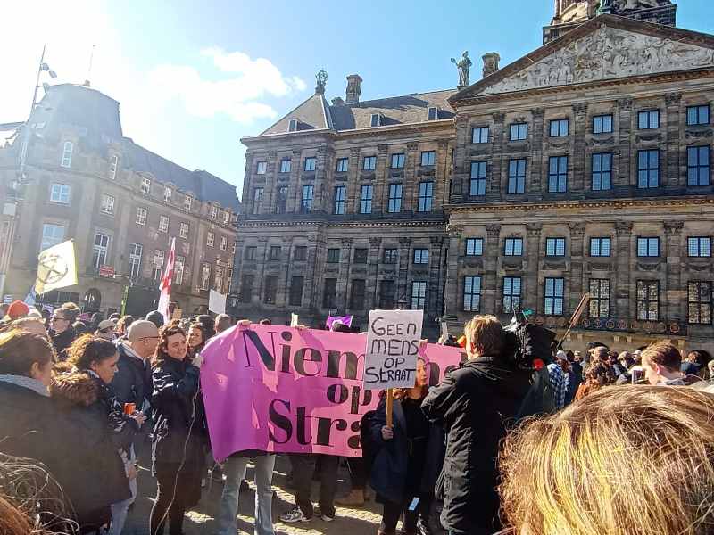 Het was mijn eerste demonstratie. Mooi om mee te maken maar ik hoefde er niet tussen te lopen, ben aan de zijkant gebleven om foto’s te maken. Straat Consulaat had een roze banner met de tekst “Niemand op Straat” en liep al scanderend met de andere deelnemers mee. We liepen al roepend (ik niet) van de Dam via de Kalverstraat (wat eerst niet mocht) tot aan het Amsterdamse Stadhuis aan het Waterlooplein. In het begin was er wat gaande, de ME hield heel strak toezicht, maar het kwam op mij heel gemoedelijk over. Bij het fotograferen viel mij op hoeveel ME er aanwezig was, vooral in busjes. Dat kost een aardige duit. Van al dat geld had men beter vele dakloze mensen een woonruimte kunnen laten huren voor een heel jaar.