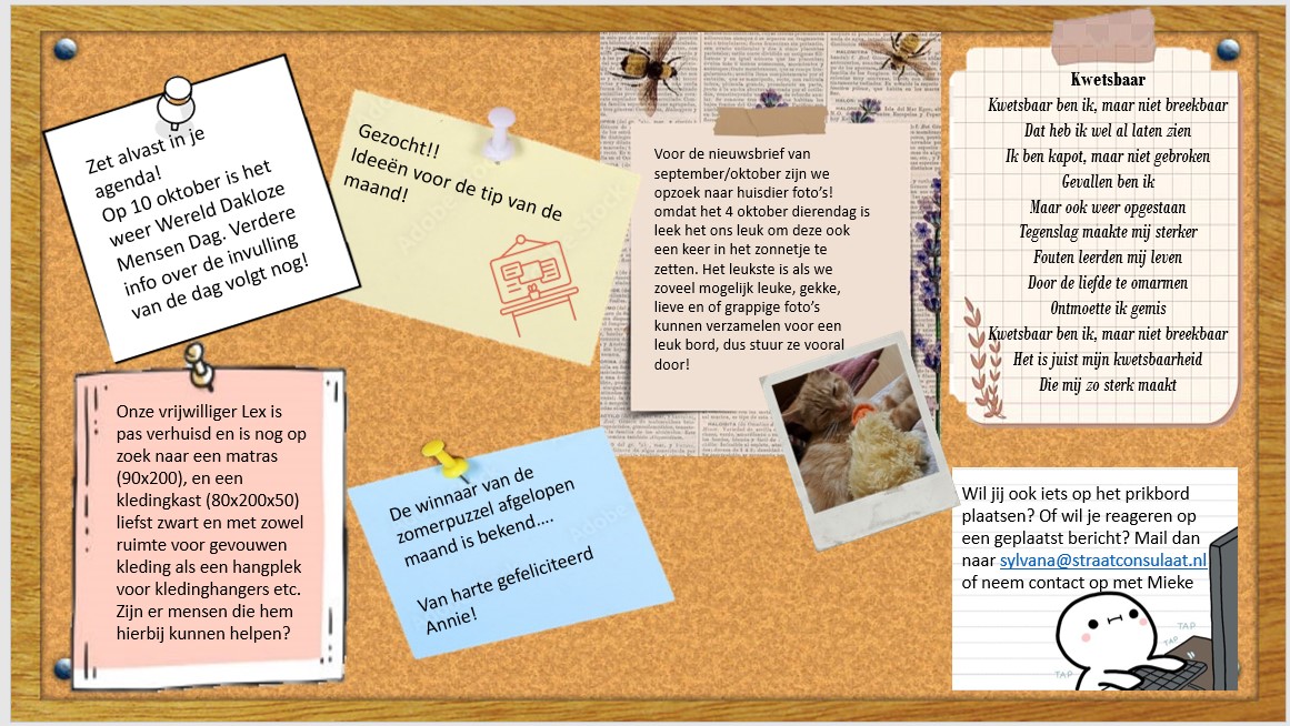 Ook deze maand is er weer het prikbord, met vraag en aanbod en het laatste nieuws. Wil jij ook iets op ons prikbord delen? Leuk! Laat het even weten via onderstaande contactpersonen.