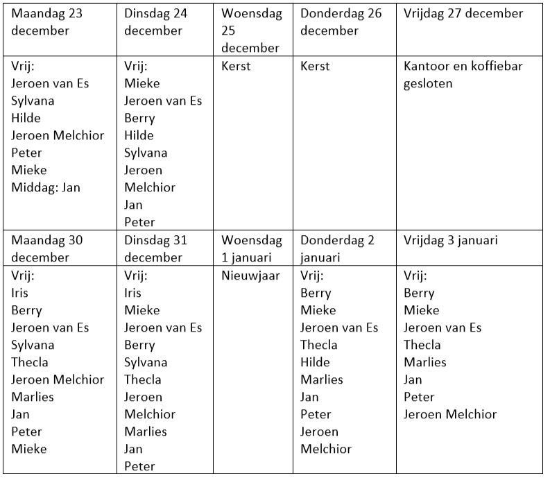 Tijdens de kerstvakantie zijn er heel wat mensen met vakantie. Daarom een overzicht, zodat je weet wie er wel en niet zijn. Handig voor jezelf en als mensen in de koffiebar naar medewerkers vragen. We zijn op de feestdagen en op 27 december helemaal dicht. Op de andere dagen is de koffiebar open en bieden wij clientondersteuning.