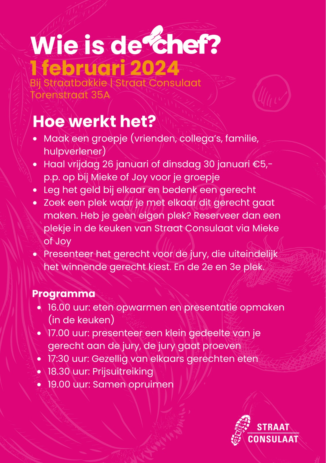 Geef je dan op voor deze training bij Roos Schrama. Je kan haar bereiken via roos@dev.straatconsulaat.nl (mailto:roos@dev.straatconsulaat.nl) of op 06-34623071. Voor het volgen van deze training hoef je niet dakloos (geweest) te zijn. We vinden het ook fijn als je mensen in je omgeving vertelt over deze kans, dus ken je iemand voor wie het misschien wat is, stuur deze informatie vooral door!